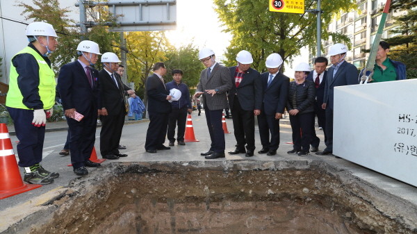 최근 서울 성동구가 오는 2018년 8월을 목표로 사근삼거리~한양대병원 삼거리 일원 ‘사근동길’ 820m에 대한 전기·통신 지중화사업을 착공했다. 사진은 사근하이츠아파트 인근 전기·통신 지중화 공사현장을 방문한 정원오 구청장과 김달호 구의장 등 관계자들의 모습.(사진제공=성동구청)