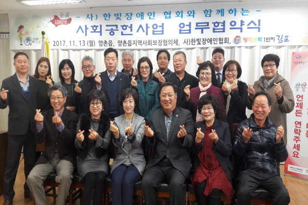 경기 김포시 양촌읍은 지난 13일 양촌읍행정복지센터에서 양촌읍 지역사회보장협의체와 (사)한빛장애인협회 간 사회공헌사업 업무협약식을 개최했다. 사진은 협약식 참여자들이 기념촬영을 하는 모습.(사진제공=김포시청)