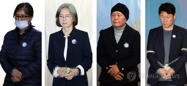 14일 오전 최순실(왼쪽부터), 최경희 전 이대총장, 김경숙 전 이대 신산업 융합대학장, 남궁곤 전 이대 입학처장 등이 서울 서초구 서울고등법웝에서 열린 정유라씨의 이화여대 입학 및 학사 특혜 관련 항소심 선고에 출석하기 위해 호송차에서 내려 법정으로 향하고 있다.