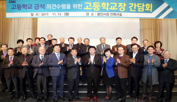 정찬민 경기 용인시장은 지난 13일 시청 컨벤션홀에서 지역내 31개 고등학교 교장들이 참석한 가운데 ‘무상 급식·교복 지원’과 관련한 여론을 수렴하고자 열린 간담회에 참석했다. 사진은 정 시장을 비롯해 참석한 교장들이 기념촬영을 하는 모습.(사진제공=용인시청)