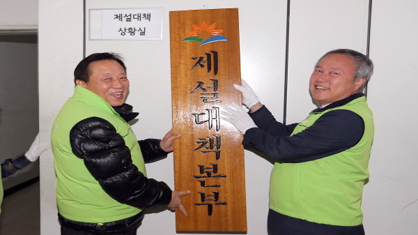 금천구가 지난 15일 오전 9시30분에 구청 종합청사내 U-통합운영센터에서 재난(제설)안전대책본부 발대식을 가졌다. 사진은 차성수 구청장(왼쪽)과 이병한 부구청장이 제설대책본부 현판을 들고 포즈를 취하는 모습.(사진제공=금천구청)