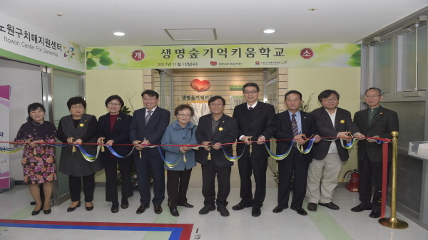 김성환 노원구청장은 지난 15일 경증치매환자 지원을 위해 조성된 ‘생명숲기억키움학교’의 개소식에 참석했다. 사진은 김 구청장(오른쪽 다섯번째)과 구 치매지원센터 관계자를 비롯한 지역주민 등이 개소식에서 테이프 커팅을 하는 모습.(사진제공=노원구청)