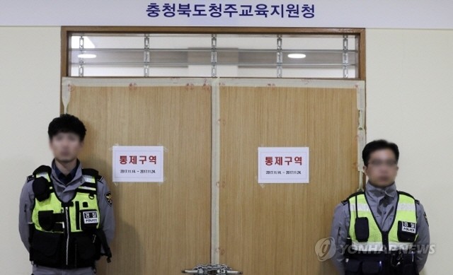 포항 지진 여파로 대학수학능력시험이 1주일 뒤로 연기된 16일 오전 청주시 서원구 청주교육지원청에 마련된 수능 문답지 보관 장소에 경찰들이 경비를 서고 있다.