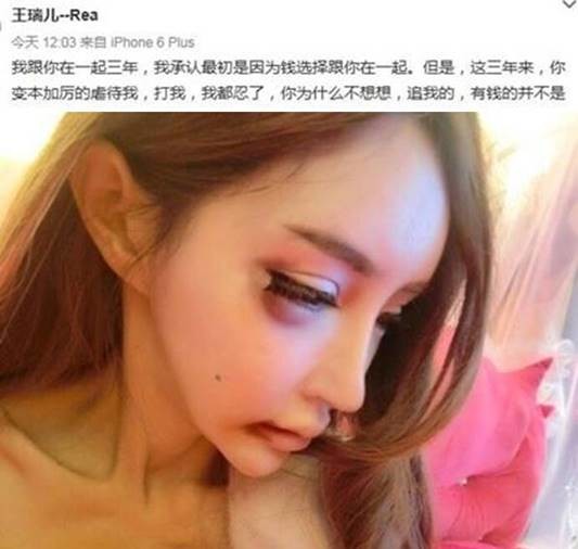 인형 외모로 유명한 왕루이얼은 자신의 웨이보 계정을 통해 연인에게 그동안 데이트 폭력 당한 사실을 글과 사진으로 남겼다. 그녀는 “지난 3년간 갖은 고문과 구타가 있었음에도 너를 사랑했지만 더이상 참을 수 없다”라고 고백했다.