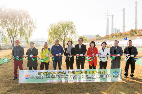 최근 서울 양천구 안양천 다목적운동장에서 개최된 '안양천생태공원 파크골프장 준공식'에서 김수영 양천구청장이 테이프커팅을 하고 있다. 구는 주민들의 여가생활 및 건강증진을 위해 전연령층이 즐길 수 있는 파크골프장을 안양천 생태공원에 조성했다.(사진제공=양천구청)