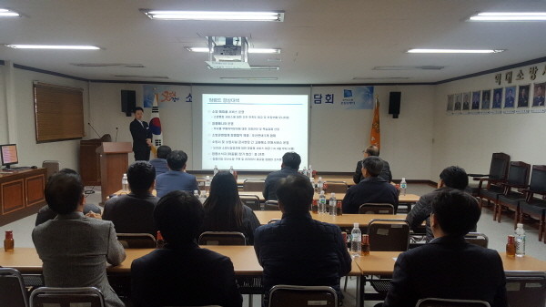 최근 경기 오산소방서가 소방서 대회의실에서 소방관련업체 관계자 27명을 대상으로 간담회를 열고, 청련환경 조성 및 부실 소방공사 방지를 위해 소방서와 소방관련업체 간 심도 있는 방안 등에 대한 논의를 펼쳤다. 사진은 간담회를 진행 중인 모습.(사진제공=오산소방서)