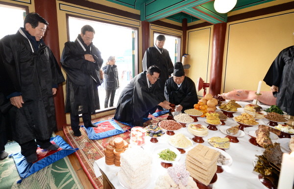 지난 18일 서울 동대문구가 청량리동 마을마당에서 ‘산신제(山神祭)’와 답십리1동에서 ‘장령당(도당)제’를 펼쳤다. 사진은 답십리1동에서 열린 ‘장령당(도당)제’에서 제를 올리고 있는 유덕열 구청장(가운데)의 모습.(사진제공=동대문구청)