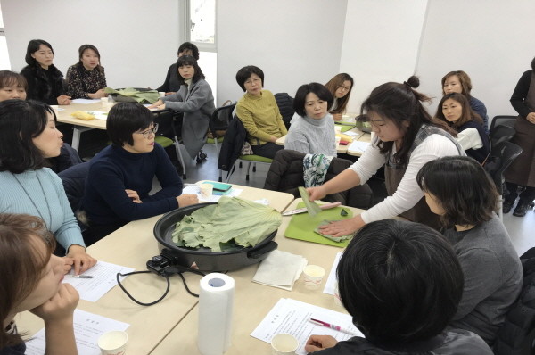 지난 20일 경기 수원시 영통구 영통2동 문화센터 2층 소리울림방에서는 '재능기부 정(情)겨운 학교 6탄'인 '우리집 건강차 만들기'가 진행됐다. 사진은 강사가 연잎 썰기에 대해 설명하는 모습.(사진제공=영통구청)