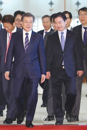 문재인 대통령이 21일 오전 홍종학 중소벤처기업부 장관(오른쪽)에게 임명장을 수여한 뒤 간담회 장소인 인왕실로 이동하고 있다.