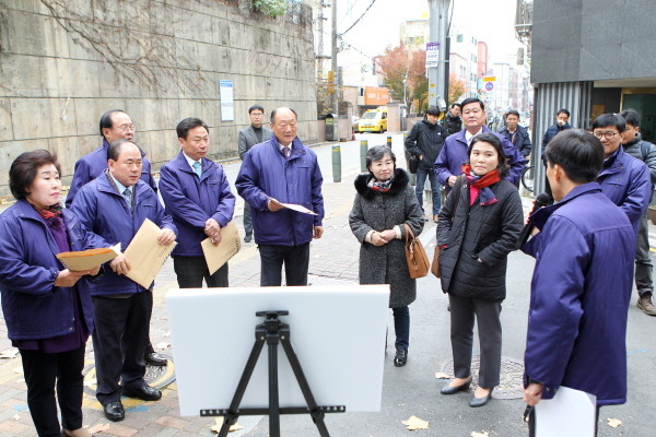 | ▲ 명일로24길 인근 학생 통학로 현장을 방문한 건설재정위원들이 현장에 대한 브리핑을 듣고있다.(사진제공=강동의회) | ||