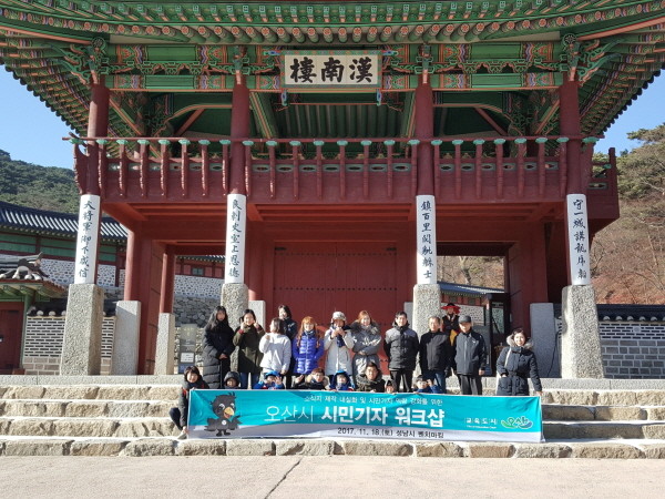 최근 경기 오산시는 시민기자와 관계 공무원 등이 참석한 가운데 ‘시민기자단 역량강화 워크숍’의 일환으로 소식지 제작 우수사례 지차체인 성남시청을 방문해 소식지를 벤치마킹했다. 사진은 이날 워크숍의 일환으로 방문한 남한산성에서 관계자들이 기념촬영을 하는 모습.(사진제공=오산시청)