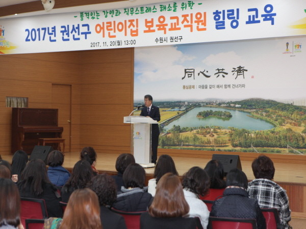 경기 수원시 권선구는 지난 20일 대회의실에서 어린이집 원장, 보육교사 등 300여명이 참석한 가운데 ‘어린이집 보육교직원 힐링 교육’을 실시했다. 사진은 행사에 참여한 이필근 구청장이 인사말을 하는 모습.(사진제공=권선구청)