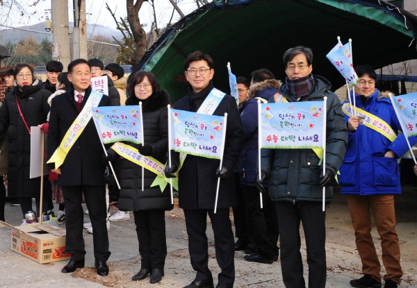 경기 포천시의회는 정종근 의장, 이명희 운영위원장, 이희승 의원, 서과석 의원, 윤충식 의원 및 의회사무과 관계자들과 함께 대학수학능력시험일인 23일 이른 아침 지역내 시험장을 찾아 2018년도 대학수학능력시험에 응시하는 수험생들을 따듯하게 격려했다. (사진제공=포천시의회)