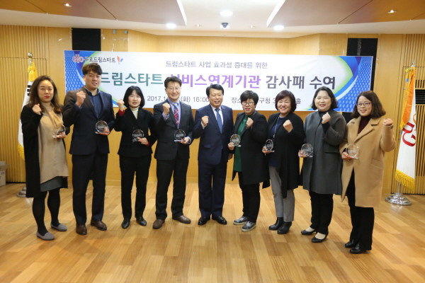 지난 21일 서울 구로구가 드림스타트 사업을 위해 이바지한 연계기관에 감사의 뜻을 전하기 위해 구청 창의홀에서 감사패 수여식을 진행했다. 사진은 이성 구청장(가운데)이 각 분야 서비스 연계기관 대표자들에게 감사패를 전달하고 기념촬영을 하고 있는 모습.(사진제공=구로구청)