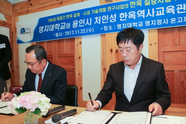 경기 용인시가 국내 최초로 경간 10m급의 대공간 한옥을 짓는 ‘처인성 한옥역사교육관’ 건립에 본격적으로 나선다. 사진은 지난 22일 정찬민 시장(오른쪽)이 유병진 총장과 한옥역사교육관 건립을 위한 협약서에 사인을 하고 있는 모습.(사진제공=용인시청)