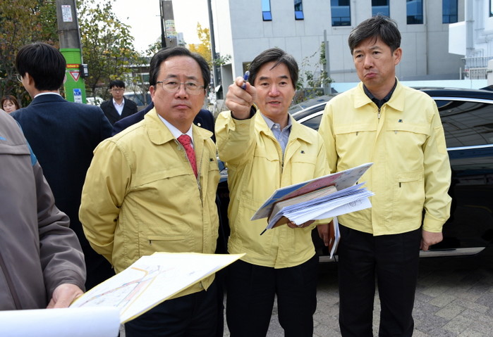 김석준 부산시교육감이 지난 24일 부산 북구 구포초등학교를 방문, 재개발공사로 인해 학생들의 안전을 위협하고 있는 통학로를 점검한 후 교직원과 대책을 협의하고 있다. (사진제공=부산시교육청)