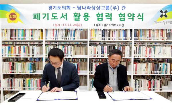 | ▲ 경기도의회 도서관에서 정기열 경기도의장(사진 왼쪽)이 탐나라상상그룹(주) 강우현 대표와 폐기도서 활용협력 관련 업무협약서에 서명을 하고 있다. | ||