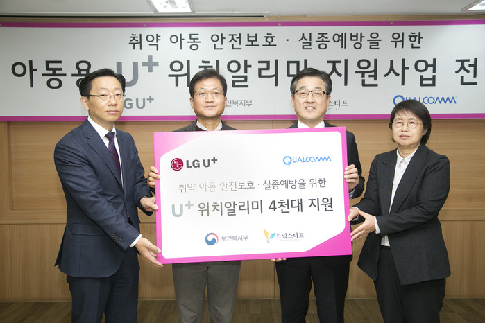 이를 위해 LG유플러스는 서울 용산구 소재 한국보육진흥원에서 이동욱 보건복지부 인구정책실장, 서문희 한국보육진흥원장, 유필계 LG유플러스 CRO 부사장, 심상규 퀄컴코리아 부사장 등이 참석한 가운데 ‘유플러스 위치알리미 보급사업을 위한 전달식’을 개최했다.
