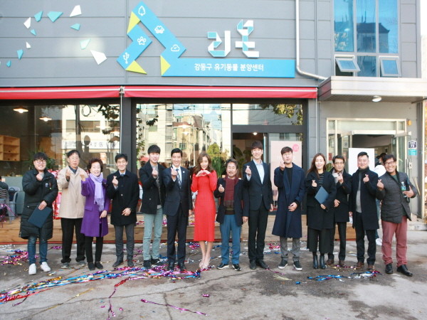 이해식 강동구청장은 지난 24일 오후 2시 ‘강동 리본(Reborn) 센터’ 개소식을 개최했다. 사진은 이 구청장을 비롯한 참여자들이 센터 앞에서 기념촬영을 하고 있는 모습.(사진제공=강동구청)