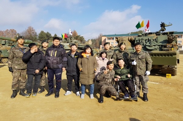 (사)한국외식업중앙회 경기도지회 여주시지부는 지난 24일 육군 제6626부대에서 ‘장애우와 함께하는 군부대 병영생활 체험 행사’를 개최했다. 사진은 행사에 참여한 관계자들이 군부대를 방문해 전차 앞에서 기념촬영을 하는 모습.(사진제공=여주시청)