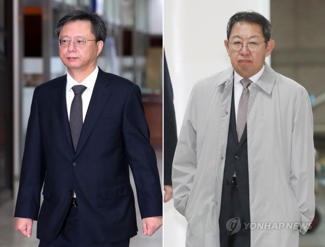 이석수 전 특별감찰관(오른쪽)과 우병우 전 청와대 민정수석(왼쪽)이 27일 오후 서초구 서울중앙지방법원에서 열린 우 전 수석의 속행 공판에 증인으로 출석하기 위해 각각 법정으로 향하고 있다.