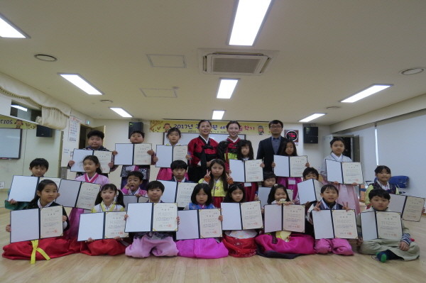 서울 강동구가 지난 25일 암사2동주민센터 다목적실에서 '구암서원 서당 가을학기 수료식'을 개최해 30명의 수료생을 배출했다. 사진은 이날 수료한 학생들이 수료증을 들고 기념촬영을 하는 모습.(사진제공=강동구청)