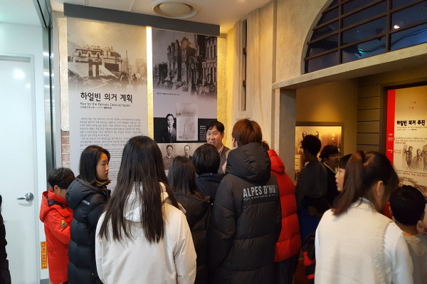 서울지방보훈청이 최근 ‘지속가능대한민국봉사회’ 소속 학생 40명을 대상으로 서대문형문소역사관 등 서울 지역내 독립운동 관련 대표적 현충시설 4곳의 탐방을 실시했다. 사진은 안중근의사기념관에서 해설사의 설명을 듣고 있는 학생들의 모습.(사진제공=서울지방보훈청)
