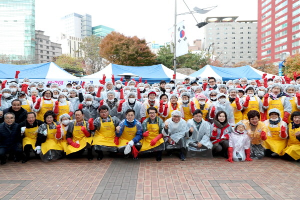 성동구는 지난 25일 구청 앞 광장에서 대한적십자사 중앙희망나눔봉사센터와 공동주관으로 ‘2017 적십자 사랑의 김장나누기’ 행사를 실시했다. 사진은 정원오 구청장, 홍익표 국회의원, 김달호 구의장, 봉사센터 관계자 등이 행사 종료 후 기념촬영을 하는 모습.(사진제공=성동구청)