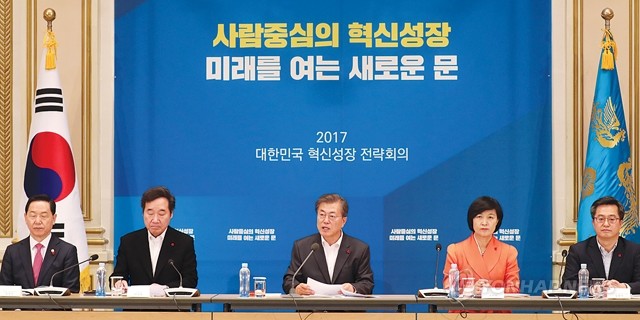 문재인 대통령이 28일 오후 청와대 영빈관에서 열린 2017 대한민국 혁신성장 전략회의를 주재하고 있다. 왼쪽부터 김상곤 부총리 겸 교육부 장관, 이낙연 국무총리, 문 대통령, 더불어민주당 추미애 대표, 김동연 부총리 겸 기획재정부 장관.