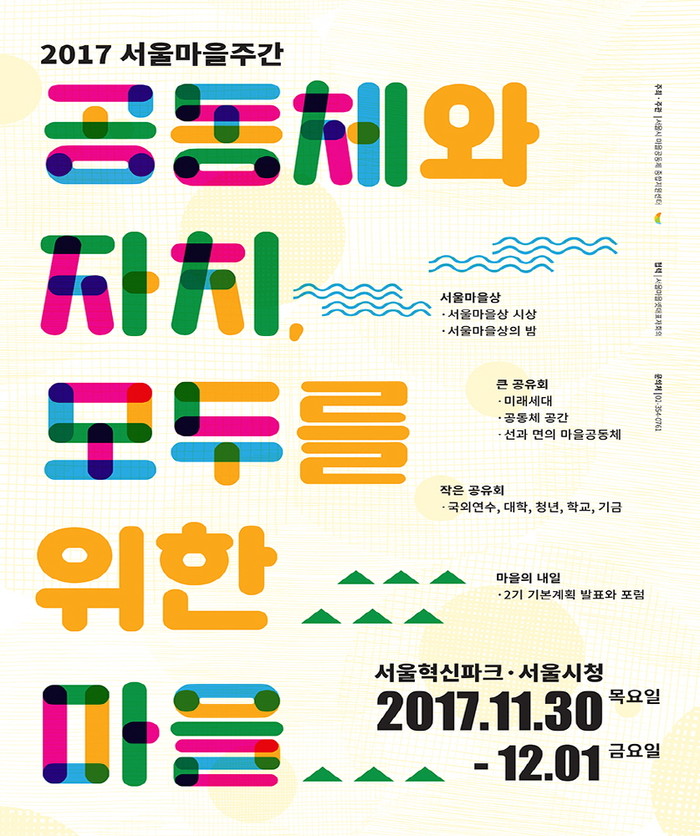 2017 서울마을주간은 서울시 마을공동체 지원정책 1기를 마무리하며 그 성과와 과제를 주민들과 공유하고, 2기 기본계획 발표를 위해 마련한 자리다. 2기 서울시 마을공동체 지원정책 기본계획은 ‘마을의 내일’에서 확인할 수 있다.