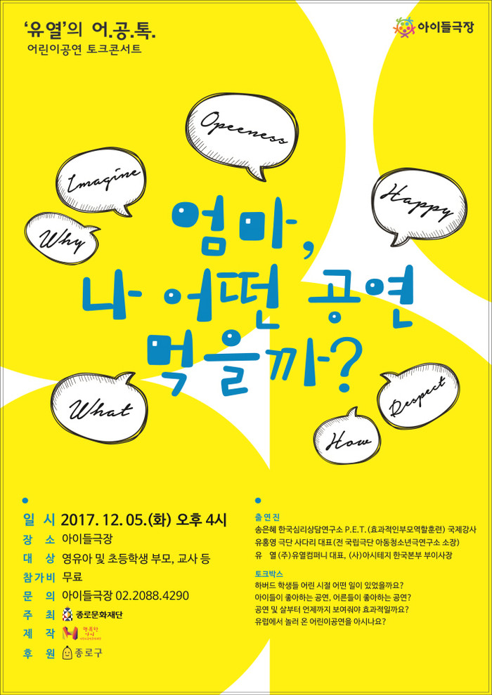 이번 토크콘서트는 어린이들이 창의적인 인재로 성장하기 위해 필요한 문화적 환경 조성과, 종로아이들극장의 발전적 운영방향을 찾기 위해 바람직한 공연 감상 방법, 아동 심리 분석을 통한 문화교육 등을 토크콘서트 형식으로 진행한다.