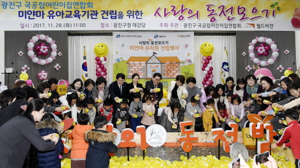 지난 28일 광진구청 대강당에서 열린 ‘사랑의 동전 모으기’ 행사에 참가한 구립 어린이집 원장 및 어린이와 함께 김기동 구청장이 저금통을 개봉하고 있다. 구는 지역내 33곳 구립어린이집에서 참여해 1년 동안 사랑의 빵 저금통을 통해 모은 동전을 국제구호기관인 월드비젼에 전달할 예정이다.(사진제공=광진구청)
