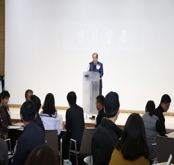 지난 28일 오후 박홍섭 마포구청장이 마포중앙도서관 세미나실에서 열린 진로멘토 감사의 자리에 참석해 80여명의 참여자들에게 인사말을 건네고 있다.(사진제공=마포구청)