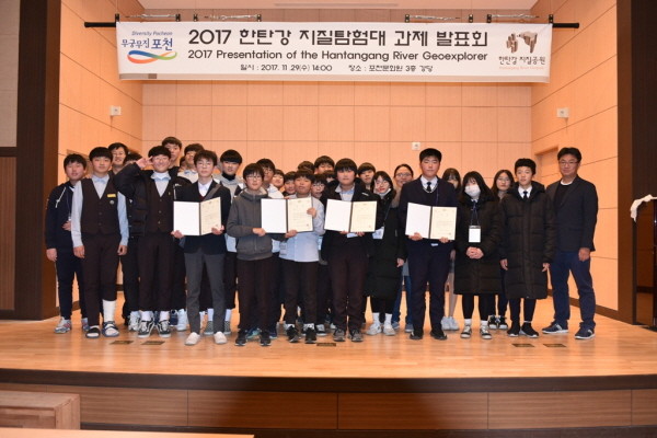 경기 포천시는 지난 29일 포천문화원 강당에서 최종 17개팀 50여명의 학생들이 참석한 가운데 '한탄강 지질탐험대(Geo Exploer School) 경진대회'를 개최했다. 사진은 경진대회에 참석한 학생들이 시상 후 기념촬영을 하는 모습.(사진제공=포천시청)