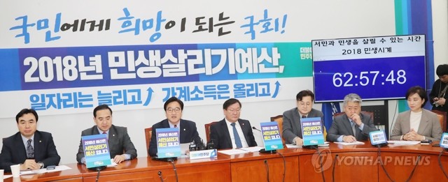 더불어민주당 우원식 원내대표가 30일 국회에서 열린 정책조정회의에서 내년도 예산안 처리를 통해 서민과 민생을 살릴 수 있는 2018 민생시계가 62시간여 남았다며 예산안의 법정시한 처리를 촉구하고 있다.