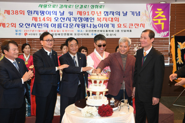 경기 오산시는 지난 30일 ‘제91주년 점자의 날’을 맞이해 ‘제14회 오산시 시각장애인 복지대회’와 ‘제12회 오산시민의 아름다운 사랑나눔이야기 시각장애인 효도 큰잔치’를 개최했다. 사진은 행사에 참여한 곽상욱 시장과 손정환 시의장 등 관계자들이 기념 케익 커팅을 하는 모습. (사진제공=오산시청)