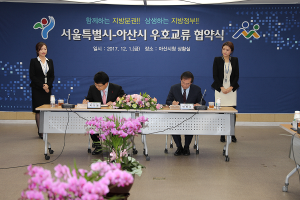 | ▲ 복기왕 아산시장과 박원순 서울시장 협약에 서명하고 있다.(사진제공=아산시청) | ||