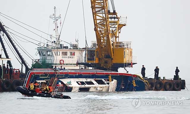 3일 오후 인천시 옹진군 영흥면 영흥대교 남방 2마일 해상에서 크레인 선박이 전복사고로 침몰한 낚싯배를 인양하고 있다.