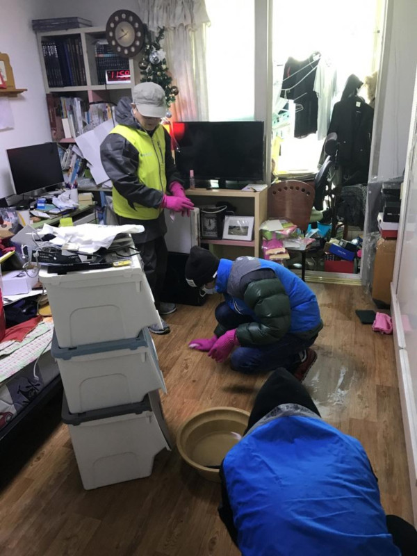최근 양천구 목1동지역사회보장협의체가 쓰레기 더미와 해충으로 가득찬 한 주거취약계층의 주거환경개선을 위해 대청소와 방역소독을 실시했다. 사진은 자원봉사들이 방 안에 쌓여있던 쓰레기를 치우고 있는 모습. (사진제공=양천구청)