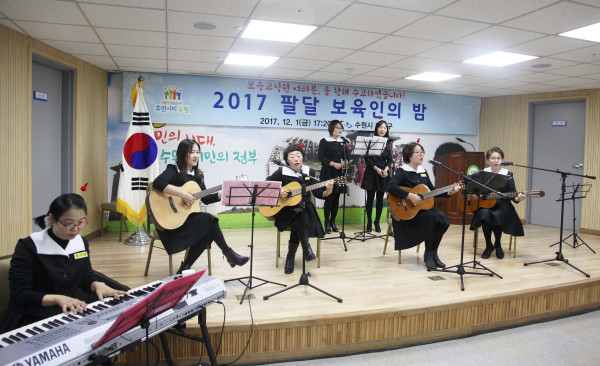 경기 수원시 팔달구에서는 지난 1일 지역내 어린이집 보육교직원 100여명과 함께 화합과 소통의 자리 '팔달 보육인의 밤' 행사를 개최했다. 사진은 보육교직원들이 기타 공연을 선보이는 모습. (사진제공=팔달구청)