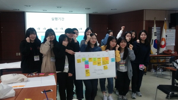 | ▲ 청소년 자치위원회 위원들이 활동계획표를 들고 기념촬영을 하고 있다. | ||