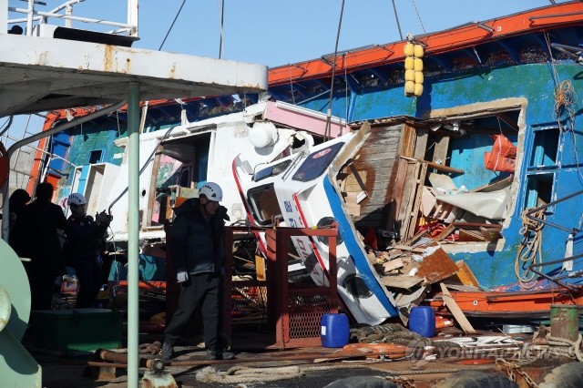 4일 오후 인천시 중구 인천해양경찰서 전용부두에서 해양경찰 등 관계자들이 낚싯배 선창1호를 현장감식하고 있다. 선창1호는 전날 오전 영흥면 영흥대교 인근 해상에서 급유선과 충돌해 전복됐다. 이 사고로 승선원 22명 중 13명이 숨지고 2명이 실종됐다.