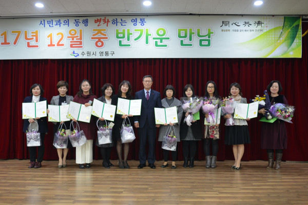 경기 수원시 영통구는 지난 4일 개최된 ‘반가운 만남의 날’ 행사에서 2017년 하반기 영유아보육발전에 이바지한 모범 보육교직원 10명에게 구청장 표창을 수여했다. 사진은 이상훈 구청장 및 보육교직원들이 기념촬영을 하는 모습. (사진제공=영통구청)