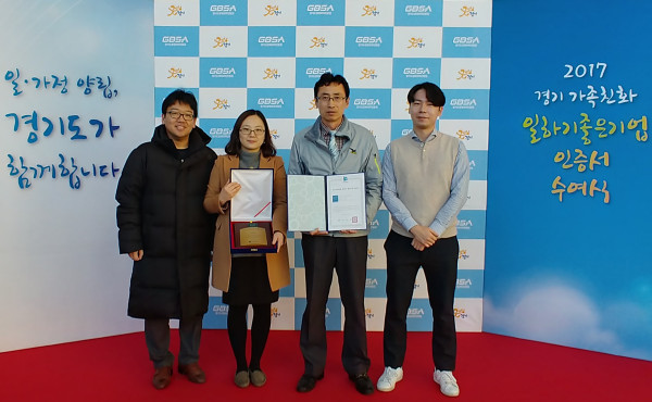 최근 경기 오산시시설관리공단이 ‘2017년도 경기가족친화 일하기 좋은 기업(GGWP)’에 선정돼 경기도경제과학진흥원에서 열린 ‘일하기 좋은 기업인증 수여식’에서 인증서를 수여 받았다. 사진은 인증서를 받은 후 관계자들이 기념촬영을 하는 모습. (사진제공=오산시청)