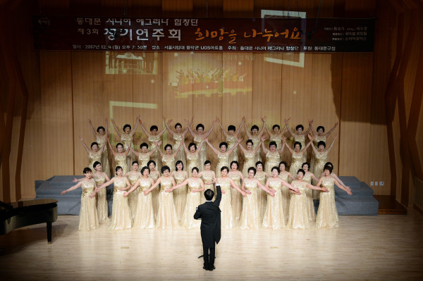 동대문구는 지난 4일 서울시립대학교 음악관 UOS아트홀에서 ‘동대문 시니어 예그리나 합창단 제3회 정기연주회’를 개최했다. 이날 합창단은 축하 꽃다발을 대신해 받은 백미(10kg 136포ㆍ약 340만원 상당)를 기부자의 이름으로 어려운 이웃을 위해 써달라며 구에 전달했다. 사진은 합창단이 공연을 선보이는 모습. (사진제공=동대문구청)