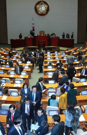 5일 오후 국회 본회의장에서 열린 예산안 및 부수법안 처리를 위한 본회의가 자유한국당 의원총회 및 예산안 실무처리 지연으로 개회 뒤 곧바로 정회돼 의원들이 본회의장을 나서고 있다.