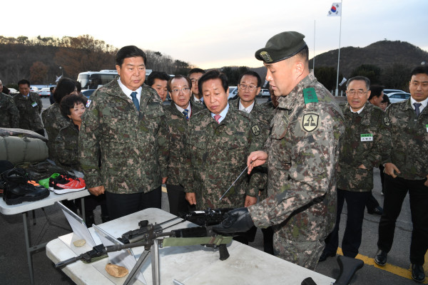 최근 이용주 서울 영등포구의장은 ‘영등포구통합방위협의회 2017년도 4/4분기 정례회의’의 일환으로 육군 제7688부대 박달예비군훈련장을 방문했다. 사진은 이 의장(가운데)과 조길형 영등포구청장(왼쪽)을 비롯한 협의회 관계자 등이 부대장으로부터 K-2소총의 기능을 설명 받는 모습. (사진제공=영등포구의회)