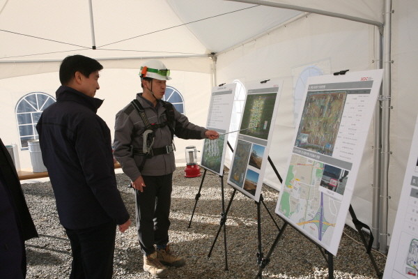 서울 강동구가 5일 겨울철을 대비해 지역내 대형건축공사장과 시설 개·보수가 예정된 건축물 3곳에 대한 동절기 현장 안전점검을 실시했다. 사진은 고덕주공5단지 건축공사장에서 이해식 구청장이 브리핑을 받고있는 모습.(사진제공=강동구청)