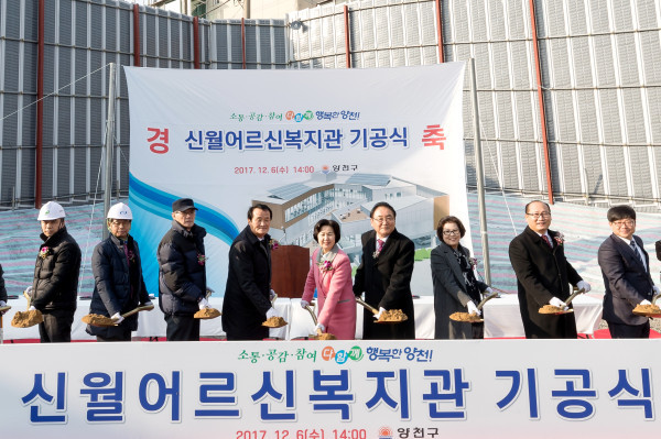 지난 6일 오후 서울 양천구 신월3동에서 열린 '신월 어르신복지관 건립 기공식'에 김수영 양천구청장과 전희수 양천구의회의장이 참석해 첫 삽을 뜨고 있다. (사진제공=양천구청)
