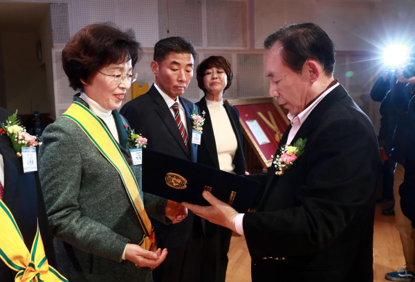 송파구는 최근 여의도 KBS아트홀에서 열린 ‘2017 대한민국 세종대왕 나눔 봉사대상’에서 3개 부문 동시 수상의 영예를 안았다. 이번 시상식에서 구는 '세종대왕 나눔봉사대상', '단체장상', '아름다운 대한국인상'까지 총 3관왕을 차지했다. 사진은 박춘희 구청장이 상장을 수여받는 모습. (사진제공=송파구청)